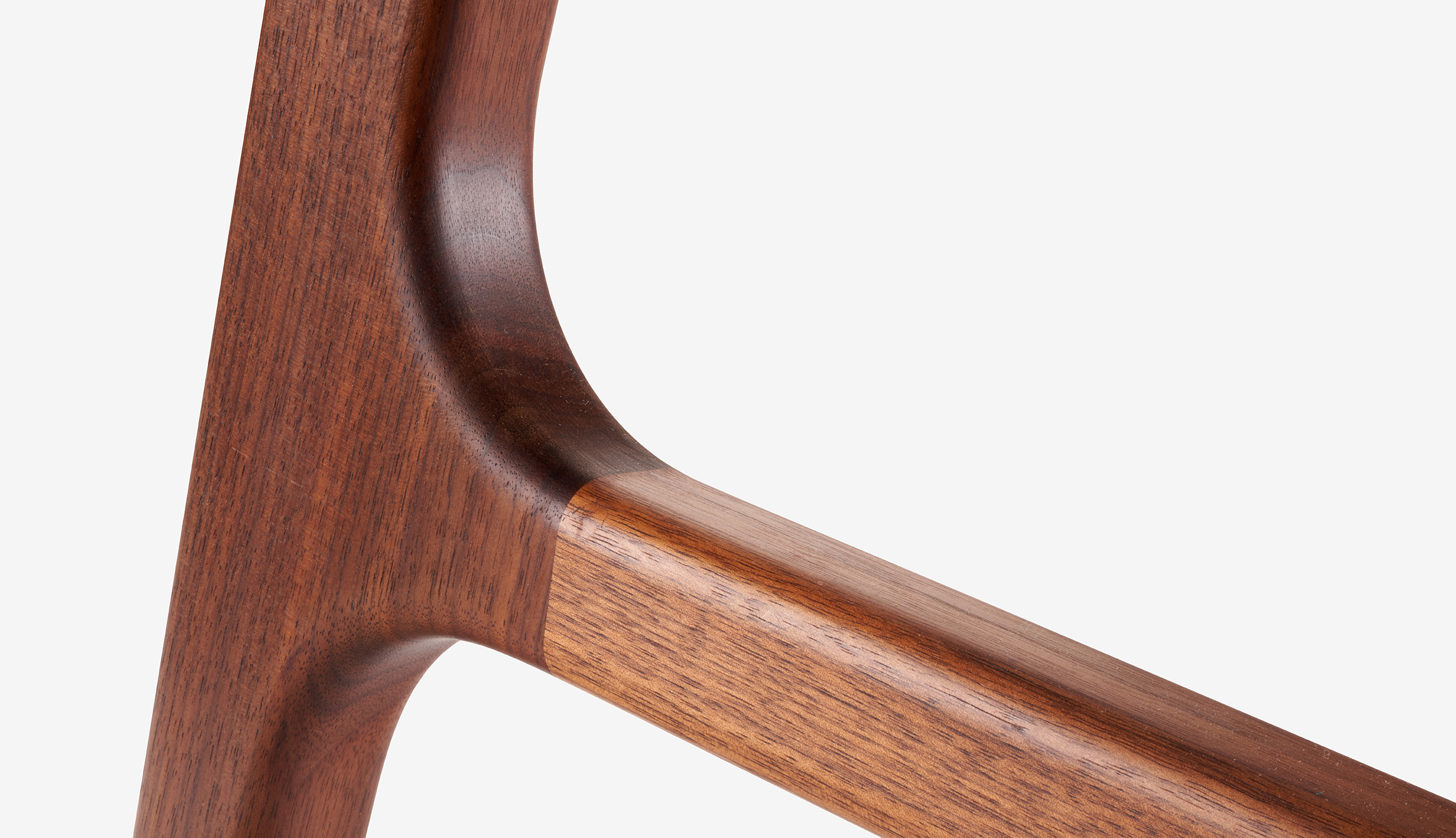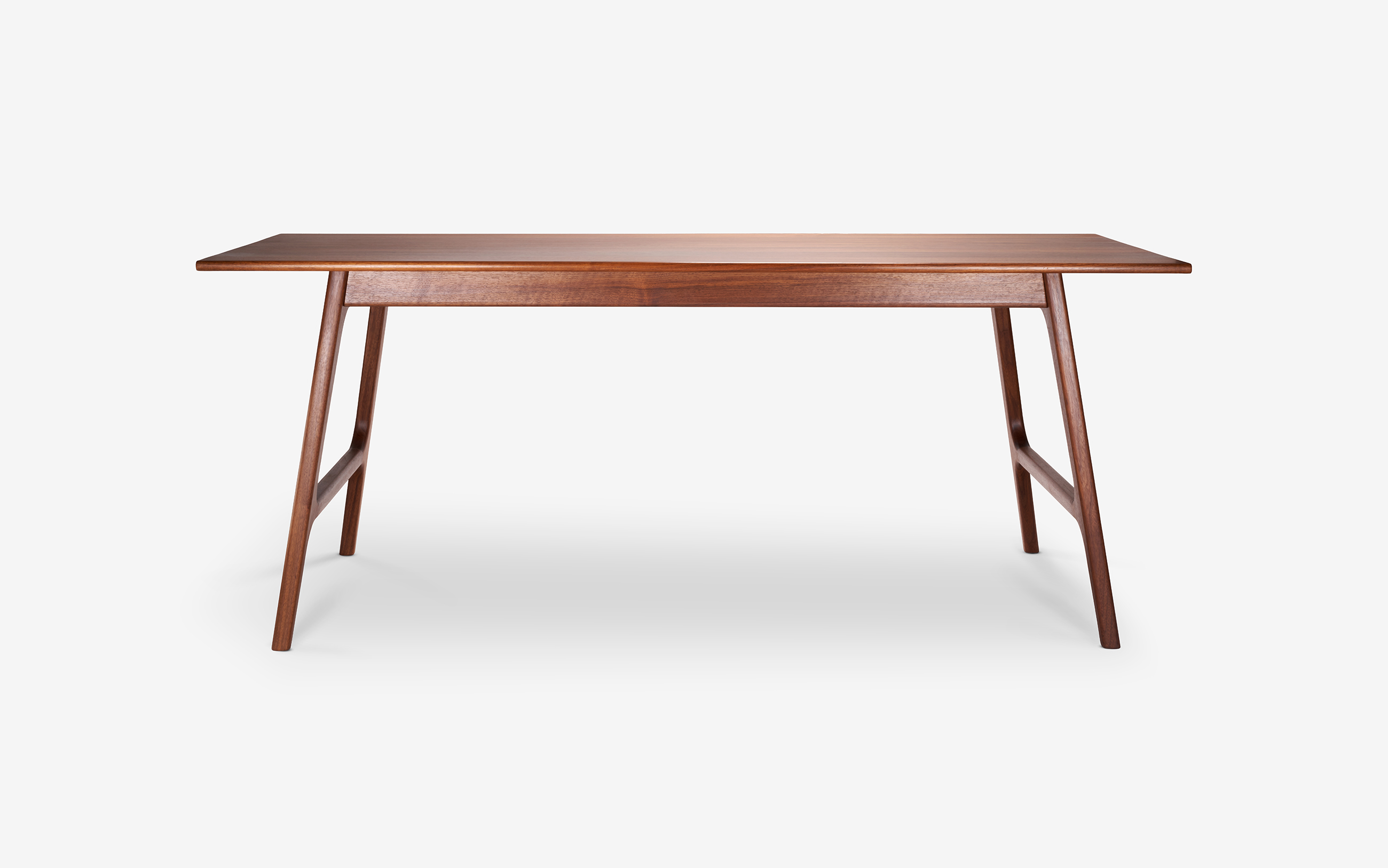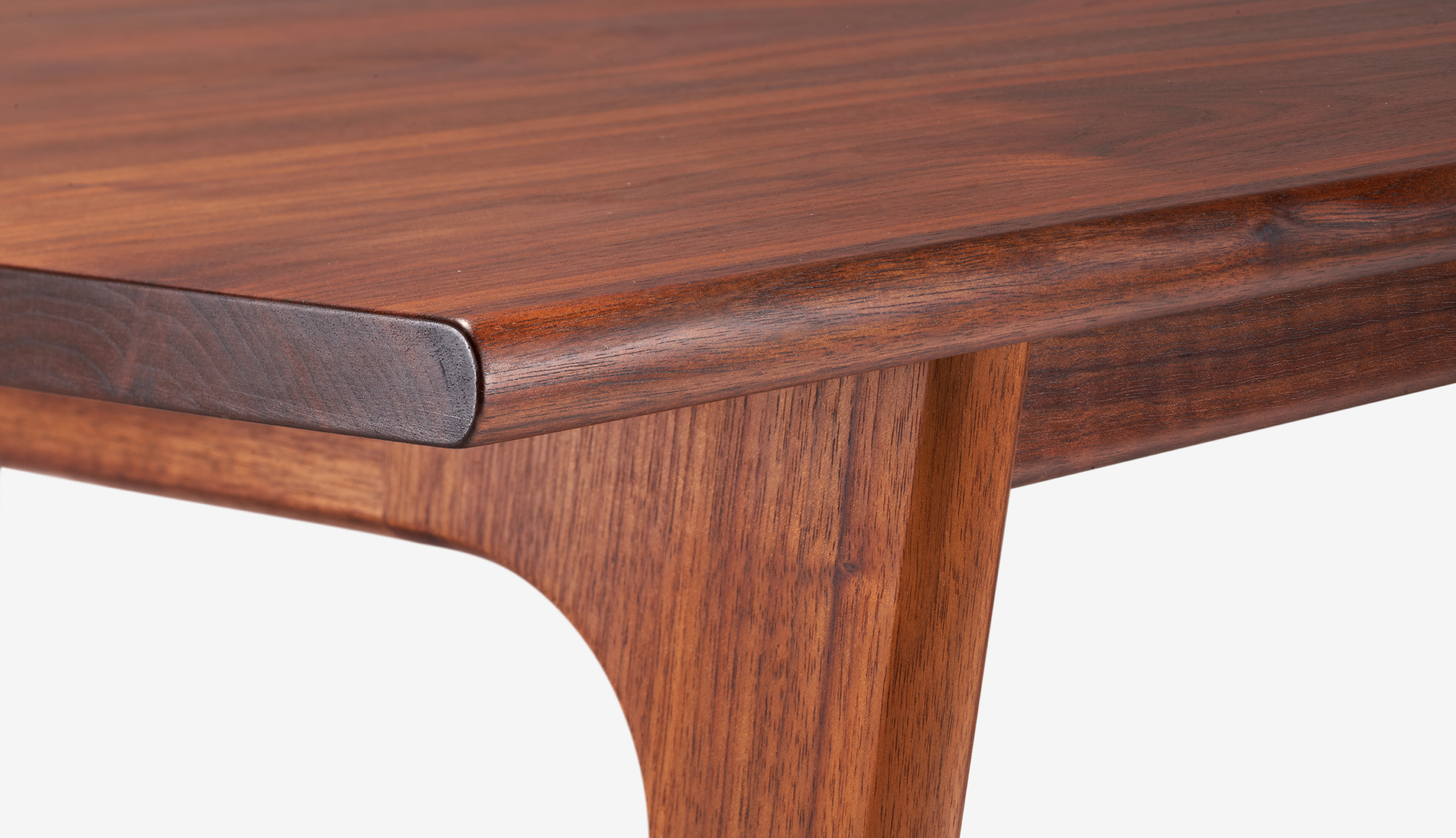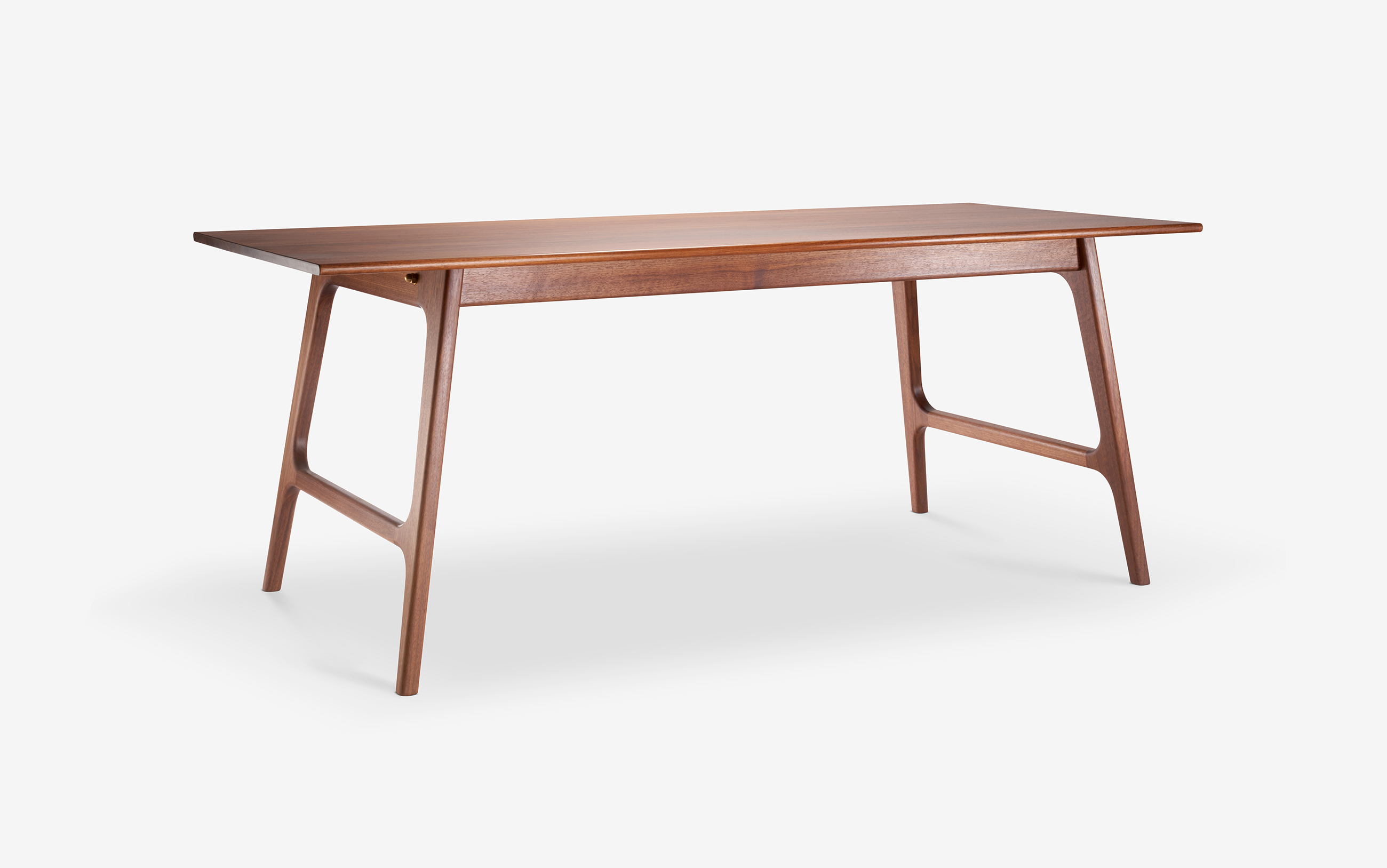 Wykonane z drewna orzecha amerykańskiego; inspirowane duńskim wzornictwem XX wieku; zaokrąglona frontowa krawędź blatu wpływa na komfort użytkowania; nieznacznie pochylone nogi oraz zaokrąglone krawędzie konstrukcji nadają wizualną lekkość; całość zdobią mosiężne nakrętki kopułkowe; możliwość dopasowania wymiaru do indywidualnych potrzeb.