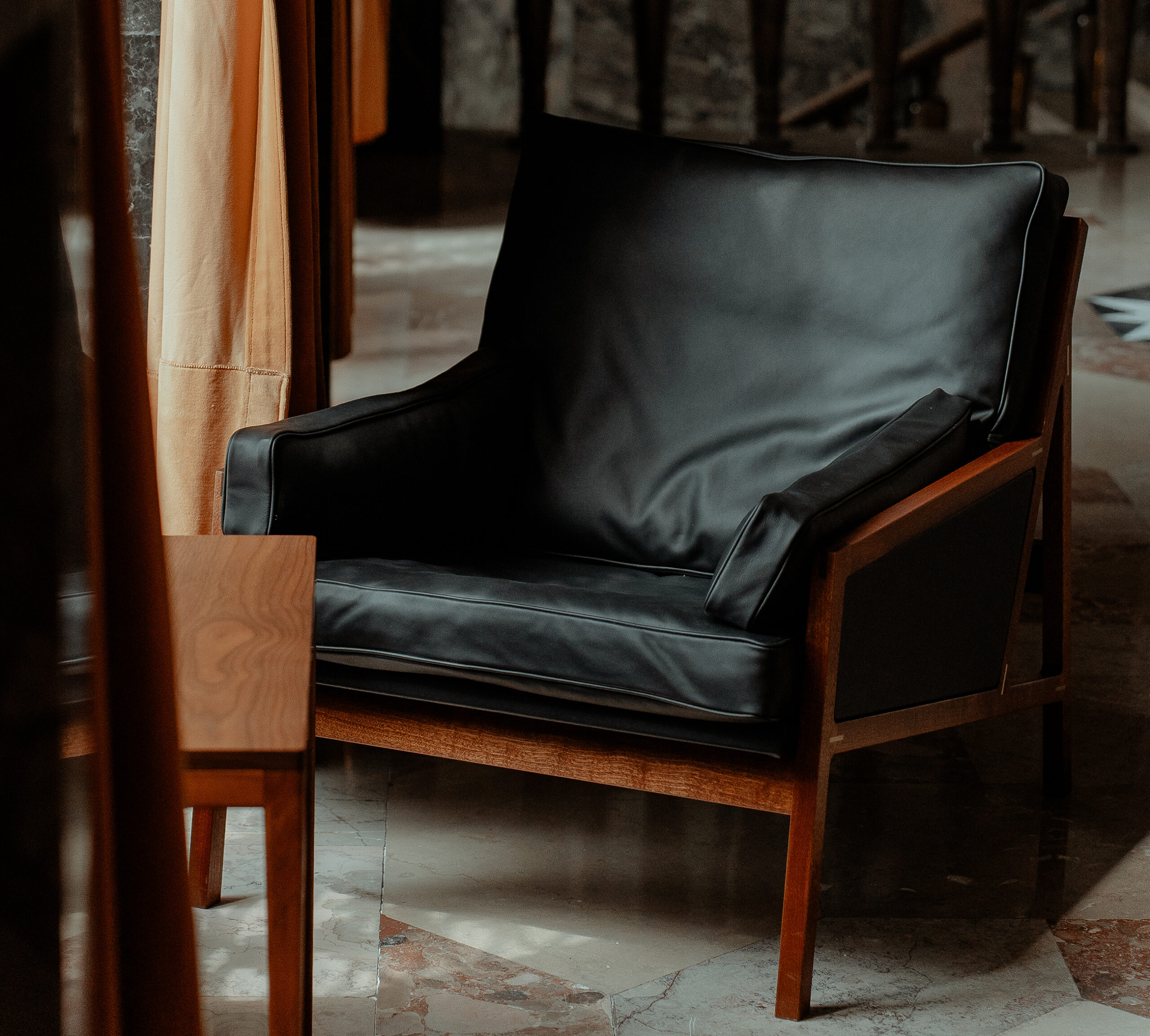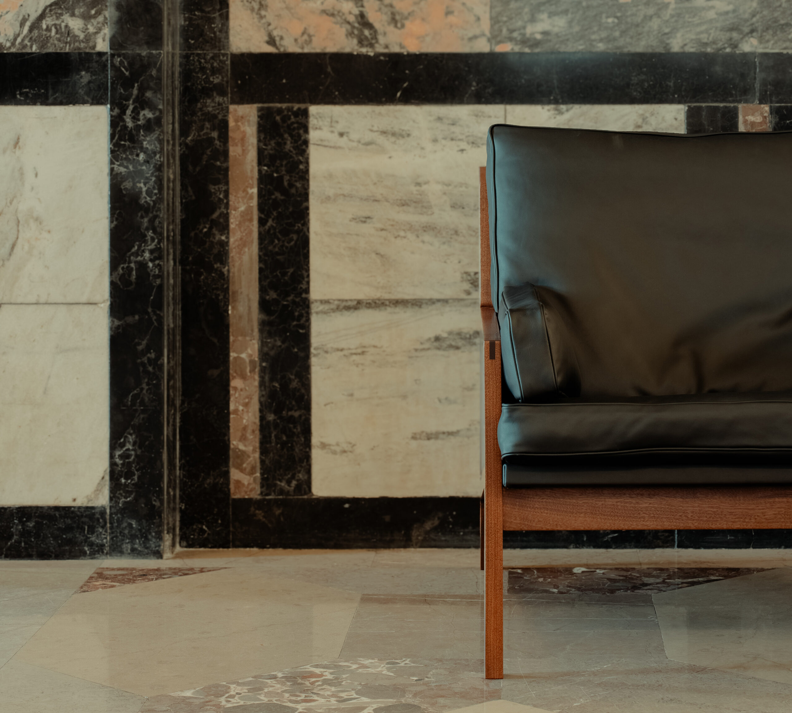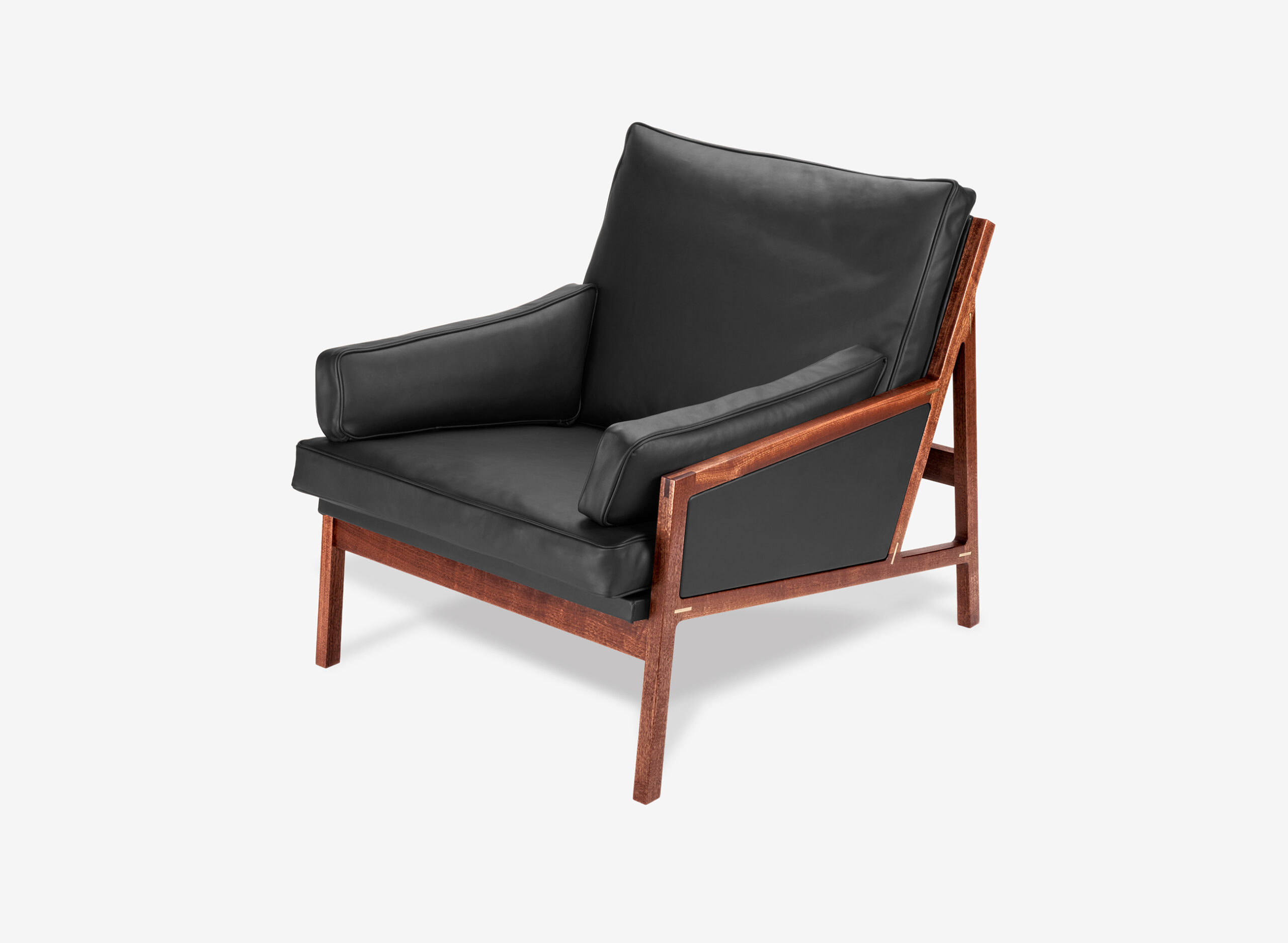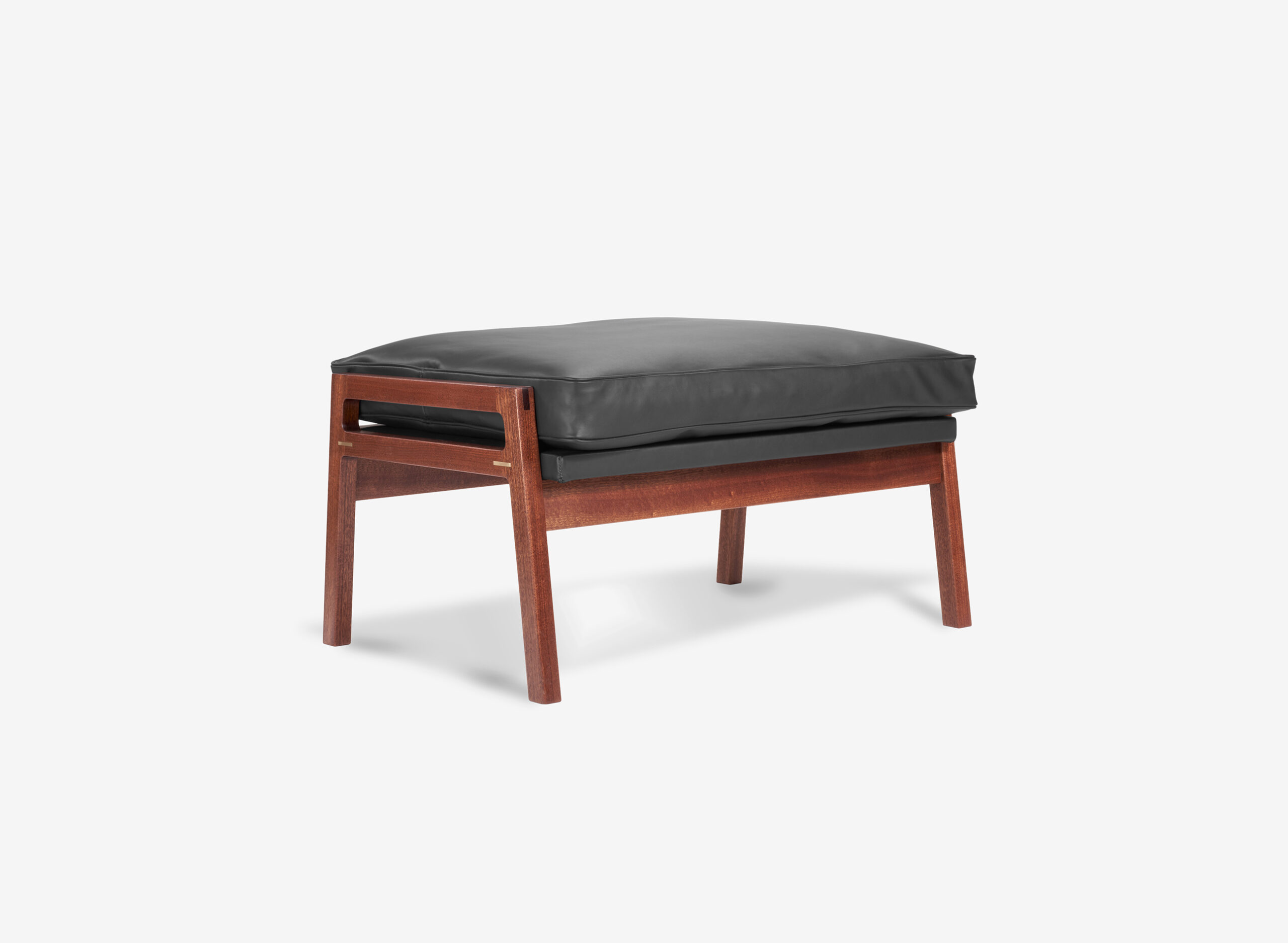 Precyzyjnie dopasowane połączenia tworzą płynne przejścia między elementami. Każde z nich ozdobione zostało mosiężną wstawką – subtelnym detalem kontrastującym z głębokim kolorem drewna sapeli.