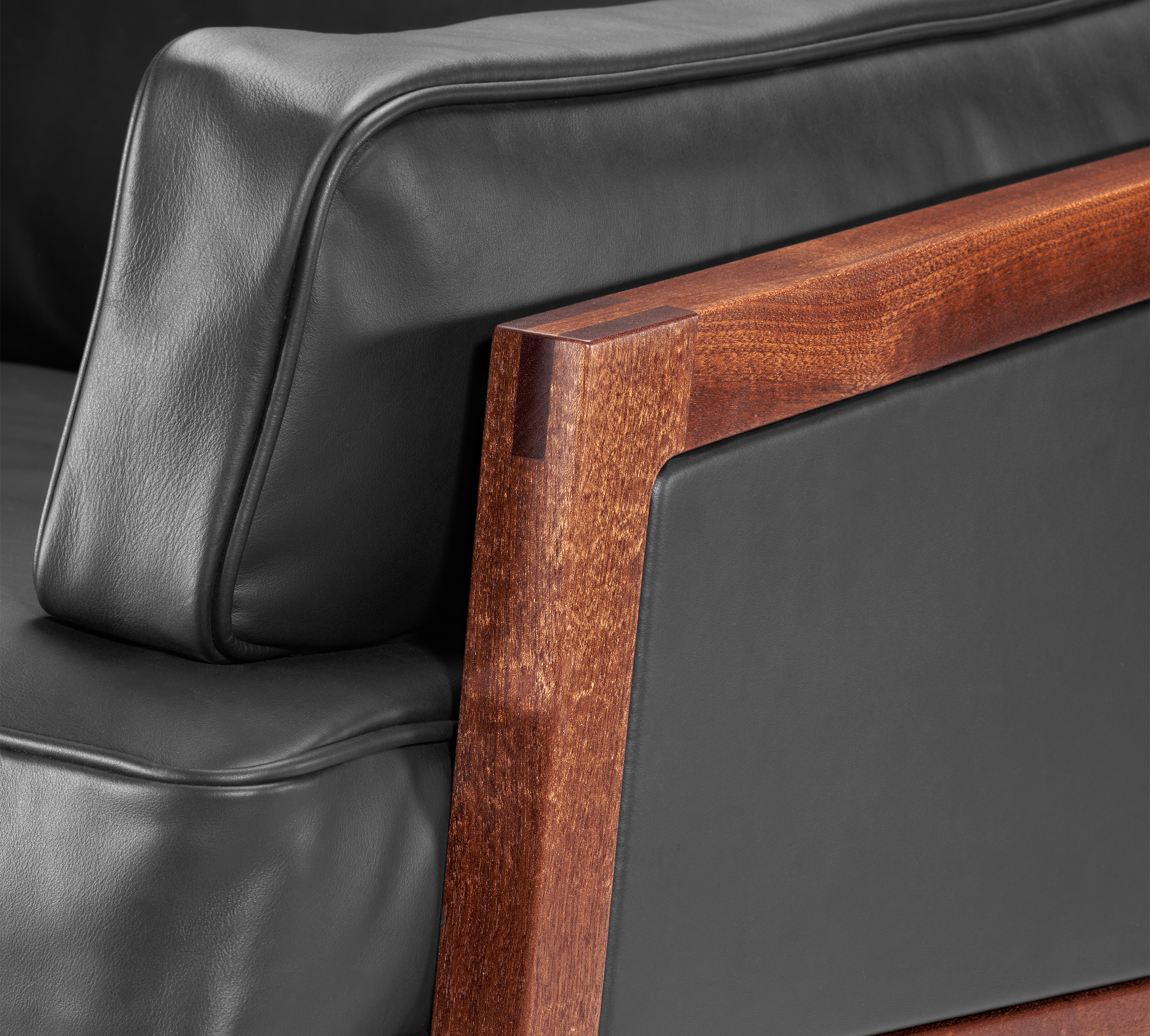 Poduszki i podłokietniki fotela wykonane są ze skóry pochodzącej z Włoch – najwyższej jakości materiału, miękkiego w dotyku, jednolitego i gładkiego na całej powierzchni. Dodatkowo elementy te wykończono kedrą, czyli skórzanym obrzeżem wpływającym na trwałość i podkreślającym misterne wykonanie fotela.